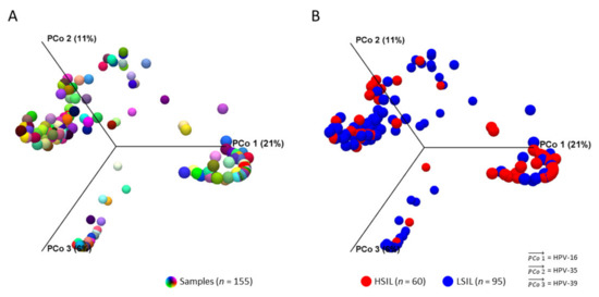 HPV community structures between LSIL and HSIL. 3D-Principal Coordinate Analysis (PCoA) plots of samples (n = 155) in distinct colors before (A) and after (B) grouping by cytological category. After grouping by LSIL and HSIL, HPV-16, -35, -39 were identified as the three most influential genotypes (vectors) in both HPV communities. Dissimilarity between the two HPV communities was HPV-16 (PCoA 1) being the most influential genotype in HSIL versus HPV-39 for LSIL (PCoA 3). β-diversity was measured by Bray-Curtis index (PERMANOVA, p < 0.05).