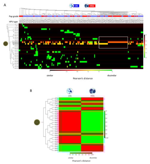 Clustered heat map of HPV abundance among LSIL/HSIL samples. (A) The heat map represents two-way hierarchal clustering of HPV over LSIL/HSIL samples (n = 155) and clustering of LSIL/HSIL samples over HPV. The dissimilarity measure i.e., Pearson’s distance (1- | Pearson correlation|) quantifies the dissimilarity in the variables of interest i.e., HPV type-specific abundance between individual samples. The agglomerative clustering method identifies the originating, most similar pair of clusters (gray shade). In this dataset, single (pure) infections of HPV-16 in HSIL and HPV-39 in LSIL of high abundance (rectangle) are the closest clusters. From this point, cluster divergence toward the left part of the heat map reveals increasingly, heterogeneous HPV infections predominantly in LSIL samples. The color scale shows Pearson’s distance between 0 (black) and 2 (green) indicating similar and dissimilar correlation coefficients, respectively. (B) Aggregated heat map of LSIL (n = 95) and HSIL (n = 60) samples reveal dissimilar, groupwise HPV profiles useful for data simplification and taxonomy development. The prevailing (abundant) genotypes for LSIL or HSIL are shown in red.