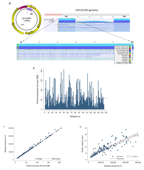 The “Map Reads to Reference” workflow runtime on this dataset (n = 155) was 45:24 min with a mean of 18 s per sample (Table 1). The workflow generated two outputs: (1) mapping report and (2) reads track. Specifically, the mapping report summarized the total number of reads, mapped/unmapped reads, intact/broken paired reads, and matched/unmatched read length distribution per sample. A representative reads track shows 208,710 paired-reads of a sample mapped onto the linearized HPV-16 reference genome (Figure 5A). Mapping fortuitously revealed lower coverage (~14,000 to 32,000 reads) between nucleotide positions 178 and 507 versus the flanking regions (~73,000 reads) probably due to library preparation bias. Coverage bias or unevenness has been attributed to low-GC target regions, library preparation enzymes, library PCR amplification, cluster amplification, and sequencing [23,24,25]. Zooming in allowed visualization of the sequences down to the nucleotide level for comparison to the reference genome and detection of variants. Detailed analysis of mapping time revealed a high correlation between runtime and number of merged sequences in a sample. Furthermore, the number of merged sequences showed a linear correlation with input file size (MB). These correlative relationships are shown in Figure 5B–D. The fitted lines may be used independently or jointly to estimate mapping runtimes from sample file size or number of merged sequences.