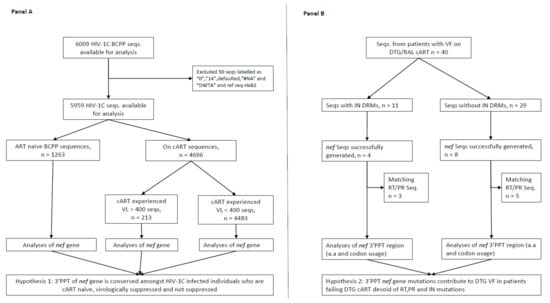 Study schema depicting the selection of study sequences. (A), selection and analysis of 3′PPT nef gene sequences according to participant cART status and HIV-1 RNA levels; (B), selection and analysis of 3′PPT of nef gene amongst individuals with VF while on DTG/RAL-based cART. Seqs, sequences; PID, participant identification number; VL, viral load; VF, virologic failure; RAL, raltegravir; DTG, dolutegravir; cART, combination antiretroviral therapy; 3′PPT, 3′-polypurine tract; RT, reverse transcriptase HIV-1 gene; PR, protease HIV-1 gene; DRMs, drug resistance mutations; HIV-1C, HIV-1 subtype C.
