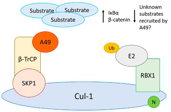 VACV protein A49 binds to and blocks β-TrCP function resulting in the absence of substrate recognition and ubiquitylation. This causes the accumulation of substrates such as IκBα and β-catenin, even in their phosphorylated forms. Poxviruses may also utilise A49 to redirect ubiquitylation towards unknown substrates, as seen with other viruses such as HIV.
