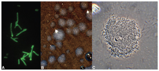 (A) Immunofluorescence-positive Xylella cells; (B) colonies of X. fastidiosa pauca ST53 isolated from a spittlebug-infected periwinkle on epi- and transilluminated BCYE medium; (C) X. fastidiosa pauca ST53 from BCYE colony seen under a phase-contrast compound microscope.