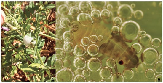 (A) Foamy mass on Vicia sp.; (B) Philaenus spumarius 3rd naiad instar bubbling on host plant.