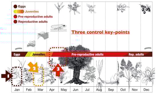 The temperature modulates the hatching [88,129] that needs exposure to a long period below 5 °C to break the eggs diapause. In Southern Italy (Apulia region), first, newborns appeared vagrant in middle February [130], but the peak in hatching is unclear, maybe because the weather varies considerably. Hatching lasts about one month, and different first instar naiades may coexist in the field for an extended period because of a long hatching interval.