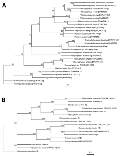 - Bakkes, D.K.; Ropiquet, A.; Chitimia-Dobler, L.; Matloa, D.E.; Apanaskevich, D.A.; Horak, I.G.; Mans, B.J.; Matthee, C.A. Adaptive radiation and speciation in Rhipicephalus ticks: A medley of novel hosts, nested predator-prey food webs, off-host periods and dispersal along temperature variation gradients. Mol. Phylogenet. Evol. 2021, 162, 107178. [Google Scholar] [CrossRef]