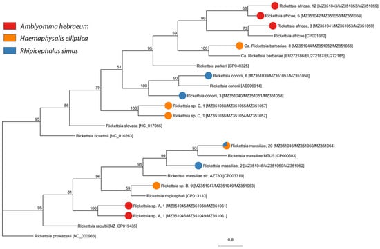 Phylogenetic analysis of Rickettsia species and genotypes inferred from concatenated ompA, ompB, and gltA gene sequences using the maximum likelihood method with 1000 bootstraps. The tick species from which each Rickettsia isolate was sequenced in this study is represented by the colored pie chart at each tip, followed by the isolate name, the number of samples, and the Genbank accession numbers in square brackets ompA/ompB/gltA). Sequences obtained from GenBank are indicated by their name and accession number. Bootstrap supports, represented as percentages, are indicated on each node. The branch length scale represents substitutions per site.