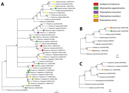 Phylogenetic analysis of (A) Theileria, (B) Babesia, and (C) Hepatozoon species and genotypes found in ticks based on a partial 18S gene using the maximum likelihood method with 1000 bootstraps. The tick species from which each isolate was sequenced is represented by the colored pie chart at each tip, followed by the isolate name, the number of samples, and the Genbank accession number in square brackets. Sequences obtained from Genbank are indicated by their name and followed by their accession number. Bootstrap supports, represented as percentages, are indicated on each node. The branch length scale represents substitutions per site.