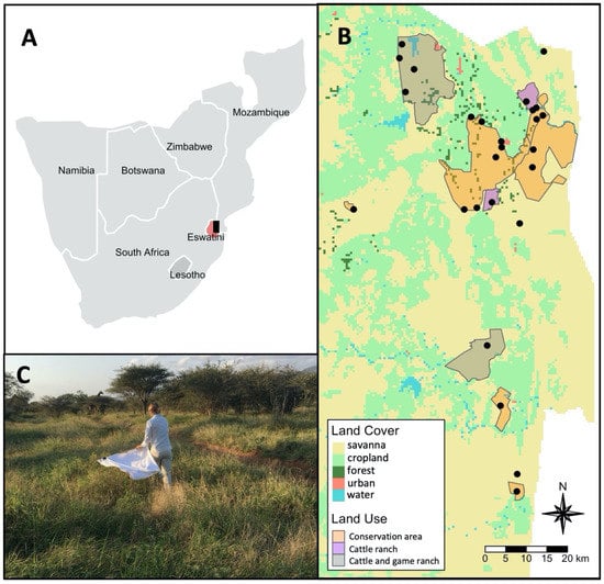 Map of study area. (A) Southern Africa showing the location of study area (black box) within Eswatini (red); (B) land-use/land-cover map and sampling locations (black dots) within the study area; and (C) an example of tick sampling by dragging a white cloth across the vegetation.