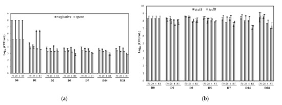 The use of human fecal samples was approved by the FDA Research Involving Human Subjects Committee (RIHSC #16-032T). Fecal samples were obtained from 3 healthy adult individuals and autoclaved to eliminate potential viable C. difficile cells and spores to ensure accurate counts of C. difficile in subsequent experiments. Autoclaved fecal samples were diluted to 3% (w/v) with pre-reduced phosphate-buffered saline (PBS, composed of 137 mM NaCl, 2.7 mM KCl, 10 mM Na2HPO4, 2.0 mM KH2PO4, pH 7.4) and spiked with the same volume of BHI broth-cultured C. difficile ATCC BAA-2155 (2 × 108 CFU/mL). Spiked fecal samples were divided into 120 aliquots of 1 mL in Eppendorf tubes and sealed tightly with parafilm, then 30 aliquots each were placed at −70 °C, −20 °C, 4 °C, and room temperature. On days 0, 1, 2, 5, 7, 14, and 28, two 1 mL aliquots were taken from each storage condition and assayed for either vegetative and spore cell counts (Figure 2a) or real-time PCR testing (Figure 2b).