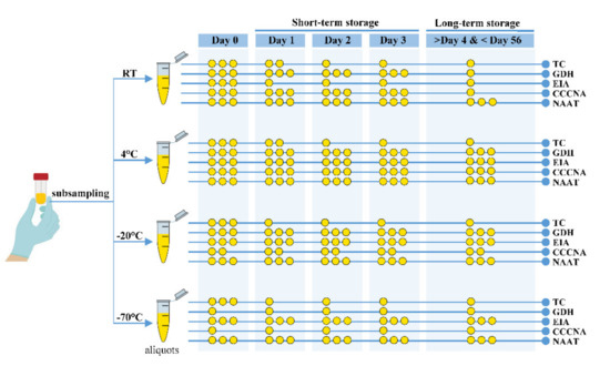 - Store the aliquots at room, refrigeration (4 °C), and freezing (−20 °C or −70 °C) temperatures (if possible).