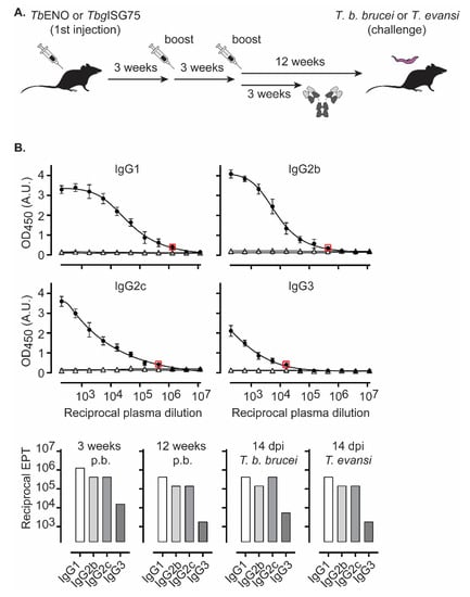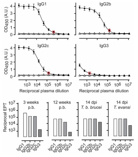 - Radwanska, M.; Magez, S.; Michel, A.; Stijlemans, B.; Geuskens, M.; Pays, E. Comparative Analysis of Antibody Responses against HSP60, Invariant Surface Glycoprotein 70, and Variant Surface Glycoprotein Reveals a Complex Antigen-Specific Pattern of Immunoglobulin Isotype Switching during Infection by Trypanosoma brucei. Infect. Immun. 2000, 68, 848–860. [Google Scholar] [CrossRef]