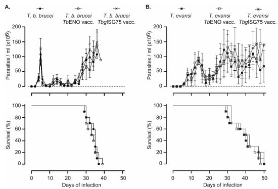 3.4. TbENO/TbgISG75 Vaccination Does Not Alter T. b. Brucei or T. evansi Infection Progression