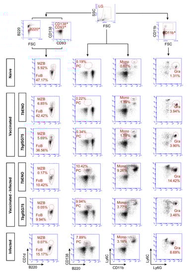 - Obishakin, E.; Trez, C.; Magez, S. Chronic Trypanosoma congolense infections in mice cause a sustained disruption of the B-cell homeostasis in the bone marrow and spleen. Parasite Immunol. 2014, 36, 187–198. [Google Scholar] [CrossRef] [PubMed]