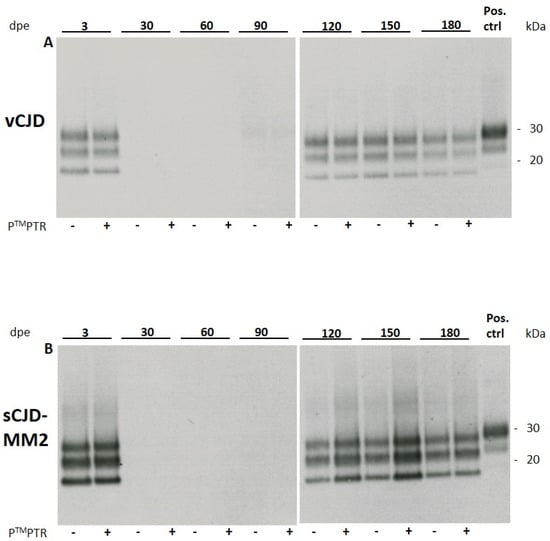 A common transfection method is the reversal of membrane polarity in order to increase membrane permeability by cationic lipids. It has been shown that the cationic lipid PierceTM Protein Transfection Reagent (PTMPTR, Thermo Fisher, Waltham, MA, USA) significantly increases the infectivity of RML prions in the scrapie cell assay []. Based on this finding, we utilised this reagent in our primary glia cell model, resulting in an enhanced PrPSc signal of sCJD-MM2 prions from 120 dpe compared to non-PTMPTR-treated cells. The variably reduced number of viable cells observed from 180 dpe onwards apparently diminished the enhanced propagation of sCJD-MM2 prions induced by PTMPTR. The effects seen at 120 and 150 dpe may have been caused by coating infectious prions in a positively charged layer of amphipathic molecules, therefore facilitating uptake into the negatively charged cell membrane []. This was, however, a pilot study and reproducibility needs to be statistically proven. Nevertheless, our findings are an obvious hint that targeting membrane polarity or other physical or chemical measures of increasing membrane permeability could potentially be a very helpful approach to improving the effectiveness of prion infection in vitro. Prior to our infection assays with human prions, we saw the described supportive effect of PTMPTR in hamster glia cultures infected with 263 K scrapie prions (n = 4; not shown) and are therefore confident that the observed effect is not only due to random variation.An explanation as to why we observed enhanced prion propagation for sCJD-MM2 but not for vCJD prions could be that vCJD shows a higher infectivity and attack rate in bioassays compared to sCJD, and that prion propagation in vitro might already occur at a relatively high level, which leaves little room for enhancement (by, e.g., PTMPTR) as opposed to sCJD prions.