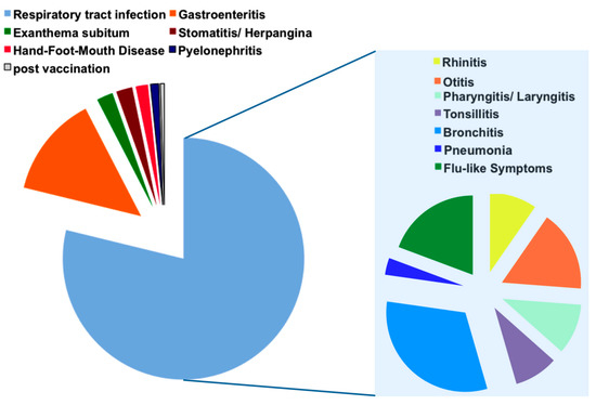 In 70 cases (38%) an upper respiratory tract infection was suspected at admission. The most common main diagnosis in the medical report, with 59 cases (32%), was a lower respiratory tract infection (LRTI), followed by an upper respiratory tract infection (URTI) with 36 cases (20%), including rhinitis, pharyngitis and tonsillitis. Flu-like symptoms were observed in 26 cases (14%), otitis media in 24 cases (13%) and gastroenteritis in 25 cases (14%). Other diagnoses were exanthema subitum and stomatitis aphthosa, both reported in four cases each (2%), and Hand-Foot-Mouth Disease in three patients (2%). Additionally, two patients suffered from pyelonephritis and one was recently vaccinated against Neisseria meningitidis B (Figure 1).