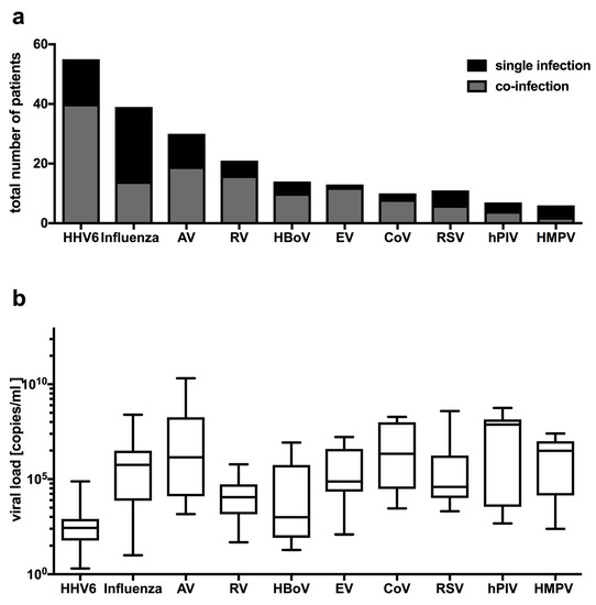 Distribution of viral pathogens in children with febrile seizures: (a) single (black) and co-infections (grey) displayed as total number of patients; (b) viral load in children with febrile seizures.