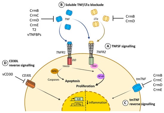 TNF cellular response and viral counteraction. (A) TNF signalling through intracellular death domains (DD) in TNFR1 recruits TRADD and triggers apoptotic cell death via RIPK1 and the caspases cascade. In contrast, prosurvival action mediated by TRAF and NF-κB can be induced through TNFR2 by either TNF or LTα. This second signalling cascade, leading to cell proliferation, can also be activated by TNFR1. (B) vTNFRs and vTNFBPs differentially bind and block TNF and LTα to prevent cytokine binding to cognate cellular receptors. (C) vTNFRs CrmB, CrmC, CrmD and CrmE can also promote reverse signalling through tmTNF at the cell surface and dampen inflammation. (D) vCD30 also induces reverse signalling through CD30L, causing inhibition of IFNγ and expression of IL8.