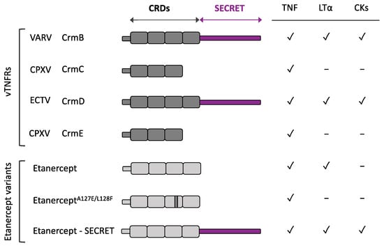 - Pontejo, S.M.; Alejo, A.; Alcami, A. Comparative Biochemical and Functional Analysis of Viral and Human Secreted Tumor Necrosis Factor (TNF) Decoy Receptors. J. Biol. Chem. 2015, 290, 15973–15984. [Google Scholar] [CrossRef] [PubMed]
