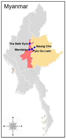 Map of Myanmar showing sample collection areas. Blue circles indicate blood sample collection sites. Yellow and red colors represent the Shan State and Mandalay Region, respectively.