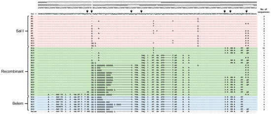 Genetic diversity of pvmsp-1 ICB 5-6 in Myanmar P. vivax isolates. A total of 39 different haplotypes of Myanmar pvmsp-1 ICB 5-6 were obtained. Multiple sequence alignment of deduced amino acid sequences of the 39 haplotypes were constructed corresponding to the amino acid sequences of the reference strains Sal I (XM_001614792) and Belem (AF435594). Amino acids identical to those of Sal I are represented by dots. The dashes represent gaps introduced to maximize the alignment. The predicted recombination sites are represented by arrows.