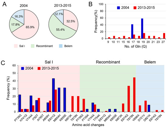 Temporal changes in the genetic diversity of Myanmar pvmsp-1 ICB 5-6 in the previous year (2004) and recent years (2013–2015): (A) time-series change of allelic types. (B) Poly-Q repeats in Belem and recombinant types. (C) Amino acid changes. Amino acid changes based on Sal I (XM_001614792) are indicated.