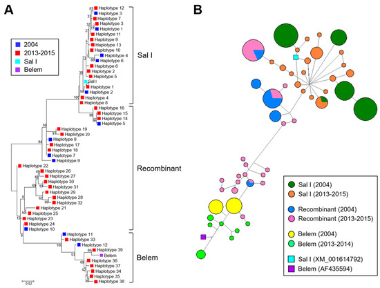 Phylogenetic analysis and haplotype network of Myanmar pvmsp-1 ICB 5-6: (A) phylogenetic analysis. The phylogenetic tree was constructed with the neighbor-joining method using the MEGA6 program. Numbers on the branches indicate bootstrap proportions (1000 replicates). (B) Haplotype network. The haplotype network was constructed with 218 sequences from two study periods (2004 and 2013–2015) and 2 reference sequences, Sal I (XM_001614792) and Belem (AF435594), by using the median-joining algorithm implemented in network version 5.0.0.3 software. Pies represent the haplotypes and lines indicate connections between neighboring pies. The size of each pie implies frequency of the corresponding haplotype.