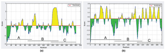 In-silico analysis of the immunogenic regions of (a) Pap31 protein; (b) SCS-α protein.