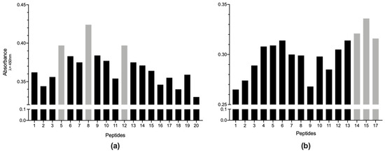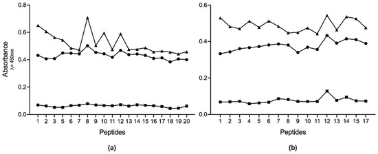 A total of 35 overlapping peptides (Table 4) were purchased from GL Biochem Ltd. (Shanghai, China) corresponding to the immunogenic regions identified, 19 peptides corresponding to Pap31, and 16 peptides to SCS-α. The peptides were designed by Epitope Mapping, with a size of 16 amino acids each, offset by 3 amino acids relative to the former, 13 of which are therefore coincident between consecutive peptides. A molecule of biotin was coupled at the N-terminus of each peptide in order to obtain more signals when performing the ELISA technique. Peptide purity was quantified by the manufacturer, being at least 95%. The peptides were dissolved according to the instructions provided by GL Biochem and stored at −80 °C until use.