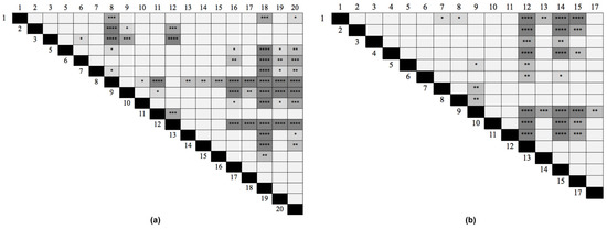Differences in the immunogenicity among peptides calculated with the Friedmann test. (a) Pap31, (b) SCS-α. p < 0.0001 (****); p < 0.0005 (***); p < 0.005 (**); p < 0.05 (*).