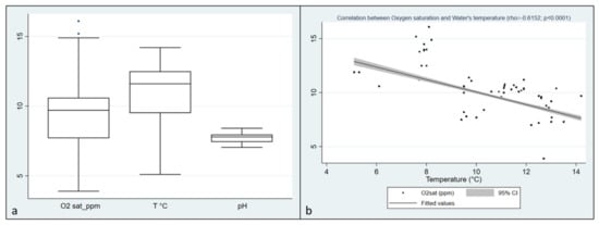 (a) distribution of Dissolved Oxygen, temperature, and pH values collected during the visits in Italian farms; (b) Correlation between Oxygen saturation and water temperature in Italian farms (rho = 0.6152, p < 0.0001).