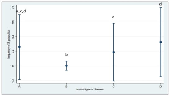 Frequencies of S. parasitica detected within the four Italian farms and the relative 95% CIs. Pairwise comparisons showed differences between farm A and B; B and C and B and D (Fischer’s exact p < 0.001), and between farm C and D (p = 0.002). Different letters indicate significant difference.