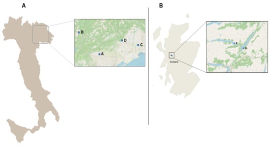Farms considered for the study. (A) Farms’ location in Italy, (B) Farms’ location in Scotland.