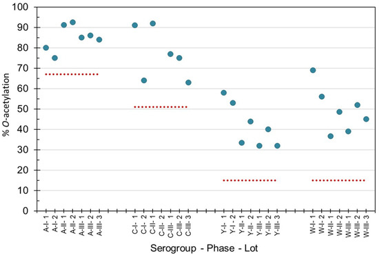 Percentage O-acetylation levels of purified capsular polysaccharide from meningococcal groups A, C, Y and W manufactured for Phase 1, 2 and 3 clinical and consistency lots of NmCV-5. 1H-NMR spectroscopy was performed at NIBSC to determine the mol O-acetyl/mol repeating unit. The dotted lines indicate the lower limits according to WHO Guidelines for meningococcal polysaccharides [24] and conjugates [25,26].