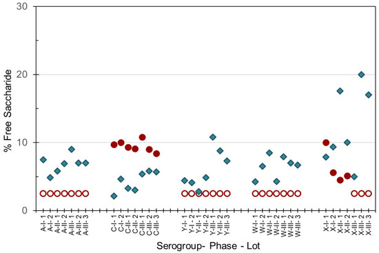 - Gao, F.; Beresford, N.; Lockyer, K.; Burkin, K.; Rigsby, P.; Bolgiano, B. Saccharide dosage content of meningococcal polysaccharide conjugate vaccines determined using WHO International Standards for serogroup A, C, W, Y and X polysaccharides. Biologicals 2021, 70, 53–58. [Google Scholar] [CrossRef] [PubMed]