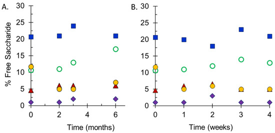 Free saccharide content of stability samples of NmCV-5 Phase 3 clinical and consistency lots. Samples were stored at 25 °C for up to 6 months (A) or at 40 °C for up to 4 weeks (B). Free non-conjugated saccharide was separated from conjugated saccharide using DOC-precipitation. Saccharide concentrations of groups A (♦), C (▲), Y (◯), W (●) and X (■) were determined by HPAEC-PAD using polysaccharide standards. Data were obtained by SIIPL and are from representative clinical consistency lots.