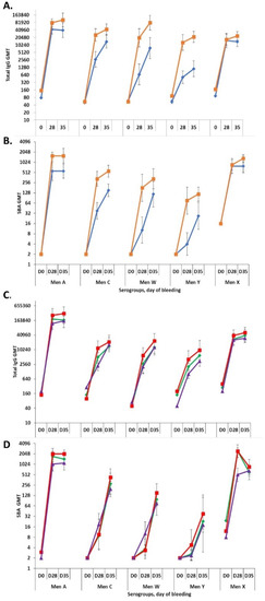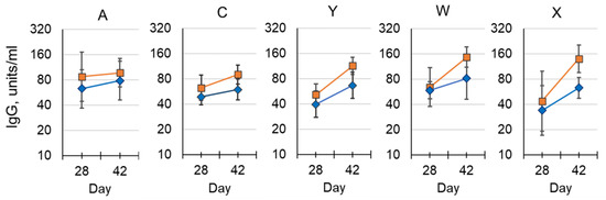 Antibody titers were determined using a multiplex bead-based IgG immunoassay and serum bactericidal assay (rSBA) using rabbit complement for meningococcal serogroups A, C, Y, W, and X.