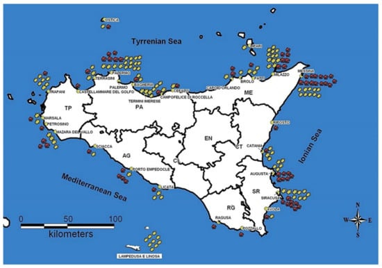 Finding locations of the analyzed subjects. TP: Trapani; PA: Palermo; ME: Messina; AG: Agrigento; CL: Caltanissetta; EN: Enna; CT: Catania; RG: Ragusa; SR: Siracusa. Red symbols represent cetaceans and yellow symbols represent sea turtles.