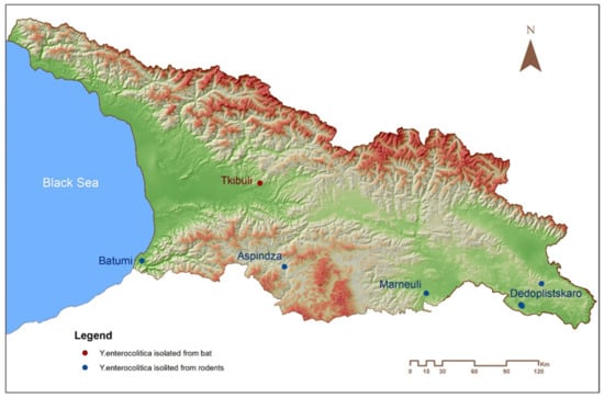 - Imnadze, T.; Natradze, I.; Zhgenti, E.; Malania, L.; Abazashvili, N.; Sidamonidze, K.; Khmaladze, E.; Zakalashvili, M.; Imnadze, P.; Arner, R.J.; et al. Identification of a novel Yersinia enterocolitica strain from bats in association with a bat die-off that occurred in Georgia (Caucasus). Microorganisms 2020, 8, 1000. [Google Scholar] [CrossRef] [PubMed]