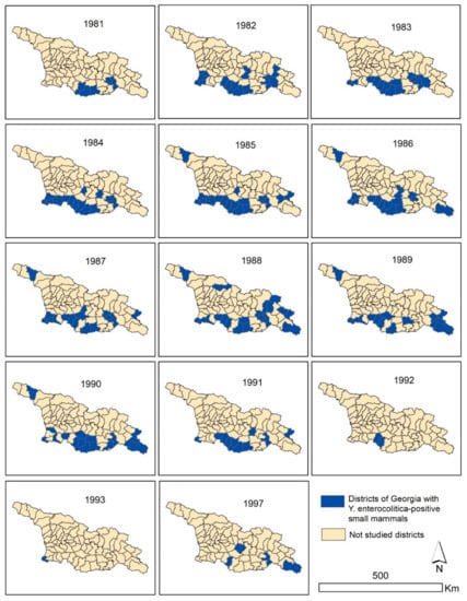 We have carefully analyzed annual reports of the Republican Anti-plague Station for the period of 1960–1997 archived at the National Center for Disease Control & Public Health (NCDC). Information on the detection of Y. enterocolitica in rodents and shrews was found in reports starting in 1981. The reported analysis covers the period from 1981 to 1997. Only common names of rodents have been provided in the reports, and where possible, the names follow current rodent taxonomy with the use of Latin names. Generally, we referred to the local Caucasian guide [22] and the checklist in [23], with some changes according to modern issues [24]. By doing this, we wish to avoid any controversy and debates between zoologists regarding taxonomic revisions. A selection of some Latin names (e.g., Apodemus versus Sylvaemus for wood mice) was made purely for a conventional purpose and does not reflect our preference for any particular taxonomic scheme. All mice belonging to the genus Apodemus were combined together because of the impossibility of species name verification.