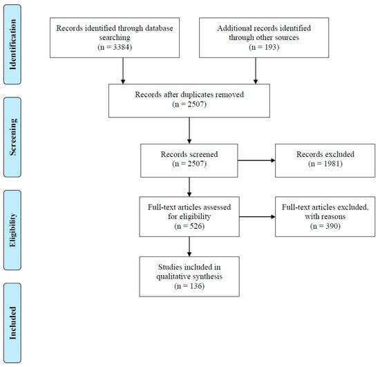 A total of 3384 potentially appropriate articles was identified via the first review phase, decreasing to 2507 upon deduplication using the Mendeley Reference Manager Software (Figure 1). The screening phase was undertaken through an assessment of article title and abstract, resulting in 526 articles going forward for eligibility assessment. Full texts were independently and concomitantly analyzed by two researchers (FA and NM), again using developed inclusion/exclusion eligibility criteria. Discrepancies between pairs of reviewers were resolved through consensus or a third adjudicator. The primary inclusion criterion was the presence of RNA or infectious (viable) SARS-CoV-2 in feces or urine of a confirmed patient and/or wastewater. Overall, upon completion of the review process, 138 articles were included for data extraction and analysis (Table 1 and Table 2). Altogether, this systematic review aims at outlining the used protocols for virus sampling, sample preparation (i.e., concentration/enrichment procedures), and analysis (i.e., target gene regions) in feces, untreated wastewater, and effluents tested in the peer-reviewed literature in order to identify actual challenges, allowing us to suggest potentially appropriate procedures and solutions. In addition, the potential risks for wastewater operators, population size normalization, and practical use of wastewater surveillance are also presented with elaborated conclusions.