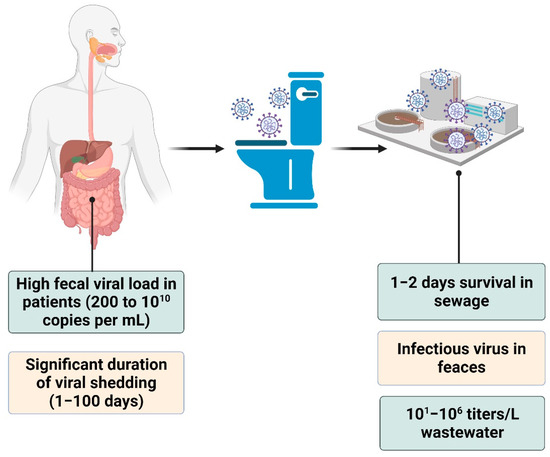 Current evidence for COVID-19 is primarily confined to flu-like symptoms with most affected patients suffering from fever, dry cough, and difficulty in breathing but some become seriously ill and even die [8,9]. The available epidemiological evidence strongly suggests that COVID-19 is primarily transmitted through respiratory droplets and contact routes [10]. Recent tracing of SARS-CoV-2 genetic material—viral RNA—in stool and urine of hospitalized COVID-19 patients [11,12,13], however, shed light on the rapidly evolving picture of this new disease. This pattern of spread is highly suggestive of virus dissemination by aqueous matrices, and the circulation of virus was speculated to be occurred from malfunctioning sewage works (sewer networks and wastewater treatment plants (WWTP)) in the community [14,15]. Sanitary facilities have been hypothesized as possible amplifiers and disseminators of the virus [16]; the pathogenic agent, most likely acquired from infected patients, may have released in their excreta (i.e., saliva, sputum, and feces) and then possibly becoming waterborne. Nonetheless, neither WHO nor the US Centers for Disease Control and Prevention (CDC) still don’t consider COVID-19 as waterborne and finding clues to support this claim throughout literature has not reached a clear conclusion.