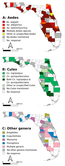 The yellow fever (Ae. aegypti) and Asian tiger (Ae. albopictus) mosquitoes are efficient vectors for dengue, Chikungunya, Zika, and yellow fever viruses, and are common in many parts of Florida [28]. Consequently, it was not surprising to find that they were named as important control priorities for many FMCDs. Both are invasive species in Florida, with the former having been introduced during the colonization of North America, and the latter in 1985 [29,30,31]. Although they originated on separate continents and have their own evolutionary history, they are behaviorally similar: they are aggressive diurnal biters and prefer to lay eggs in vessels common in urban areas such flowerpots or plastic containers.