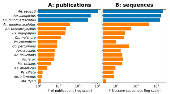 To compare the relative interest in mosquito species identified as control priorities by FMCDs with the scientific literature, we conducted searches on each species in the NCBI PubMed database (https://pubmed.ncbi.nlm.nih.gov) (30 May 2021) (Figure 6A). This search revealed that each of the three vectors with prominent global distributions, Ae. aegypti, Ae. albopictus, and Cx. quinquefasciatus, had each been published about thousands of times. The remaining 14 FMCD priority control species were described in, at most, several hundred papers, although for some species this number was far lower. An additional analysis of the NCBI Nucleotide database (https://www.ncbi.nlm.nih.gov/nucleotide/) (30 May 2021) revealed a similar trend in terms of genetic resources, as for 13/17 mosquito species, there were fewer than 1000 DNA or RNA sequences in the database (Figure 6B).