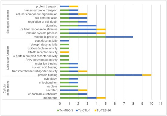 Target proteins were associated with a broad range of biological processes such as metabolism, immune system function, response to stimuli, signalling, regulation of cell death, cell differentiation, cellular component organisation and transport. The molecular functions of the identified prey were associated with protein-, ion- and nucleic acid-binding, transmembrane transporter activity, oxidoreductase, phosphatase and peptidase activity as well as receptor activity. Target proteins interacting with T. canis molecules were predominantly localized in the plasma membrane (29%) and endoplasmic reticulum (18%) or were secreted proteins (18%). The remaining target proteins were localized in the nucleus, mitochondria and cytoplasm. The full list of GO annotations is presented in the Supplementary Materials (Supplementary File S1).