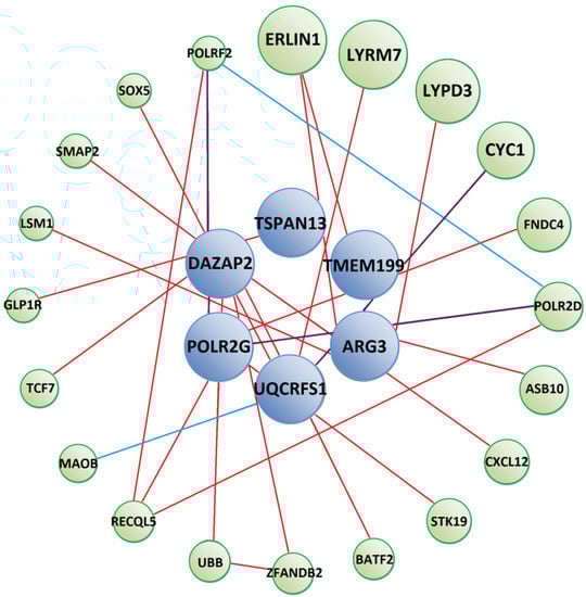 Predicted protein–protein interaction network between Tc-TES-26 interacting prey (blue circle) and other human proteins (green circles). Red lines show physical interactions, blue lines show proteins which share a common pathway and purple lines represent both types of interactions. Detailed information on interacting proteins is included in Supplementary Materials (Supplementary File S4).