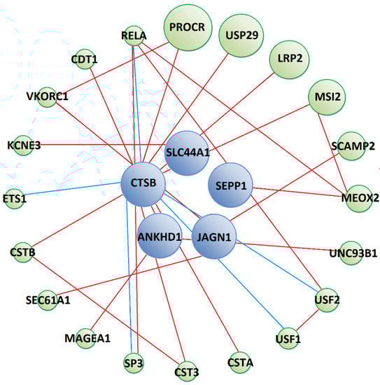 Prey that interacted with Tc-CTL-1 were predicted to form physical interactions with human proteins involved in signalling processes (PROCR, LRP2, MAGEA1), protein transport (SCAMP2, SEC61A1), immune response (UNC93B1, CTS3, CSTB, SP3, RELA) (Figure 3) and other biological processes, which are detailed in the Supplementary Materials (Supplementary File S3). Moreover, GeneMania predicted CTSB prey to participate in common pathways with several transcription factors (USF1, USF2, SP3, ETS1 and RELA), some of which are important regulators of the immune response (SP3, ETS1 and RELA). However, these interactions were not substantiated by KEGG Pathway database analysis.