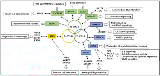 Screening of a human cDNA library led to the identification of 16 putative interacting partners for the three T. canis molecules in this study. GO analyses revealed many different molecular functions and biological processes in which these proteins may be involved. We also searched for human molecules predicted to form secondary interactions with prey proteins. It is believed that the primary role of TES products is manipulating, blocking and/or evading immune responses of the host. Therefore, we focused on the most important interactions that may provide new insights into the immunopathology of human toxocariasis, as summarized in Figure 5.