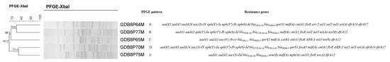 In this study, five isolates positive for blaNDM-5 gene from one swine farm were obtained. The susceptibility test indicated that five isolates were phenotypically resistant to β-lactams and displayed patterns of MDR, such as ampicillin, ceftazidime, meropenem, apramycin, florfenicol, sulfamethoxazole/trimethoprim, but sensitive to gentamycin, amikacin, colistin, and tigecycline, as shown in Table 1. According to PFGE analysis, five isolates exhibited five different PFGE patterns, designated A to E (Figure 1). Considering the source of isolates, we presumed that the dissemination of the blaNDM-5 gene may be due to horizontally transfer.