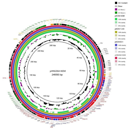 The blaNDM-5-carrying plasmid pHNGD64-NDM was sequenced using PacBio platform and assembled using HGAP version 4.0. to analyze the genetic feature. BRIG software was used to comparative analysis with other plasmid sequences published in NCBI (Genbank accession number MT407547, MN915011, MN915010). The complete genome of plasmid was annotated and analysis using RAST (https://rast.nmpdr.org/rast.cgi, accessed on 21 September 2020), ISfinder (https://www-is.biotoul.fr/, accessed on 12 September 2020), Resfinder (https://cge.cbs.dtu.dk//services/ResFinder/, accessed on 12 September 2020) and Vector NTI program (Invitrogen).
