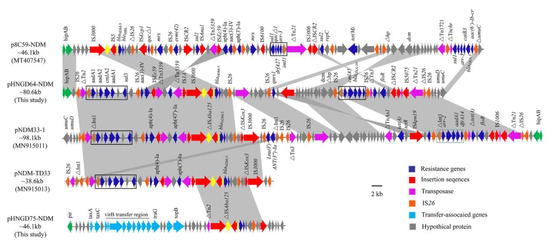 It is noteworthy that blaNDM-5 genes were in two replicon types of plasmids. After we analyzed the genomic features of these five strains by the next-generation sequencing, we found two types of plasmids in the blaNDM-5-positive strains. PCR-based replicon typing indicated that transconjugants GDB8P64J and GDB8P70J carried the IncHI2 plasmid replicon and exhibited the same MDR phenotype, while the remaining transconjugants carried the IncX3 plasmid replicon and only displayed resistance to β-lactams. A complete IncX3 plasmid carrying the blaNDM-5 gene was detected in three isolates (GDB8P65M, GDB8P75M and GDB8P77M) according to PCR mapping and the primers listed in Table 2. Sequence analysis indicated that the IncX3 plasmid pHNGD75-NDM (accession numbers MT296100) was 46,161 bp in size and was almost identical to the IncX3 plasmids found in Enterobacteriaceae such as pCNUH-14 (E. coli, MK986791) and pNDM5_IncX3 (K. pneumoniae, KU761328).
